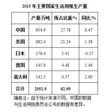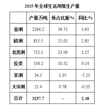 2015年,世界經(jīng)濟(jì)整體復(fù)蘇疲弱乏力,GDP僅增長(zhǎng)2.47%,自2010年以來(lái)僅略高于2013年的增長(zhǎng)水平。發(fā)達(dá)國(guó)家經(jīng)濟(jì)復(fù)蘇緩慢,新興經(jīng)濟(jì)體增速進(jìn)一步回落,世界貿(mào)易增長(zhǎng)依然疲弱,工業(yè)生產(chǎn)低迷。在上述宏觀經(jīng)濟(jì)形勢(shì)下,2015年全球生活用紙生產(chǎn)量為3257.7萬(wàn)噸,比2014年增長(zhǎng)2.48%。具體數(shù)據(jù)如下: