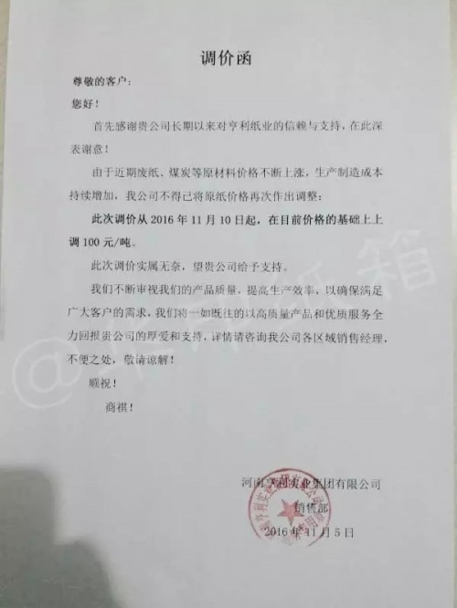 廢紙、煤炭齊漲價,河南亨利無奈宣布再次提價