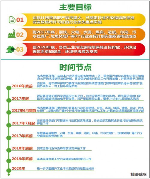 環境保護部日前發布《關于實施工業污染源全面達標排放計劃的通知》(以下簡稱《通知》),要求到2017年底,鋼鐵、火電、水泥、煤炭、造紙、印染、污水處理廠、垃圾焚燒廠等8個行業達標計劃實施取得明顯成效,污染物排放標準體系和環境監管機制進一步完善,環境守法良好氛圍基本形成。到2020年底,各類工業污染源持續保持達標排放,環境治理體系更加健全,環境守法成為常態。
