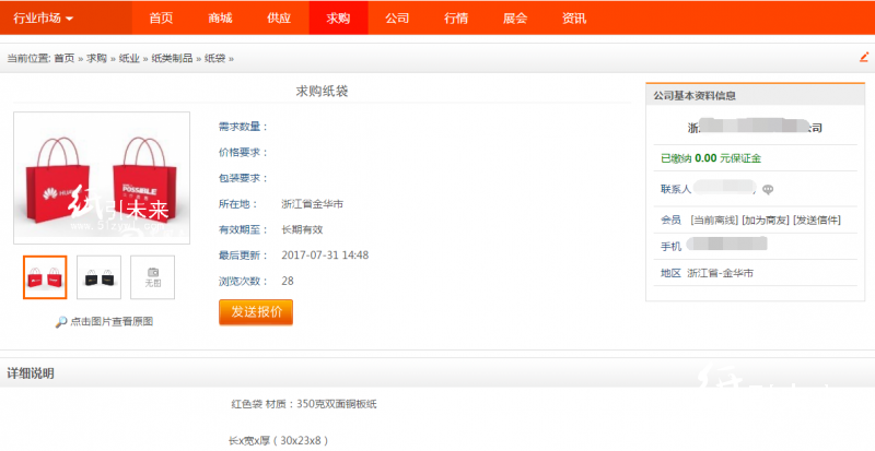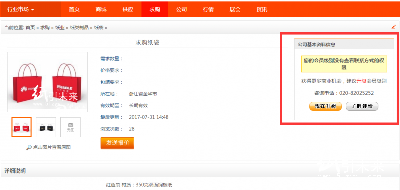 現在,只要您在紙引未來網注冊入駐,并升級為VIP會員,便可享受瀏覽海量求購信息的服務。作為紙引未來網的VIP會員,在求購信息頁面查看求購欄目,可以看到右側關于采購商的具體信息(公司/聯系人/電話/傳真/QQ/郵箱等),并可在第一時間聯系對方。非VIP會員在紙引未來網查看求購欄目,只能看見求購的貨物和需求,無法獲取采購商聯系方式。