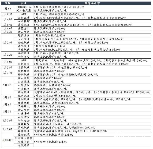 自2018年1月的第二周開始便陸續有部分基地落實瓦楞、箱板漲價,年后聯盛、榮成、金鳳凰等也紛紛加入了漲價隊列。