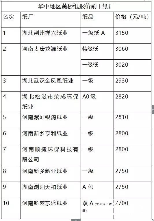 除此之外,北部地區給出的最高價是2970元/噸,緊跟其后的就是龍頭老大哥玖龍和理文了,分別給出了2930元/噸和2920元/噸的A級黃板價格。還是處于比較穩定的狀態的,可以說是跟上了漲價大潮流了。