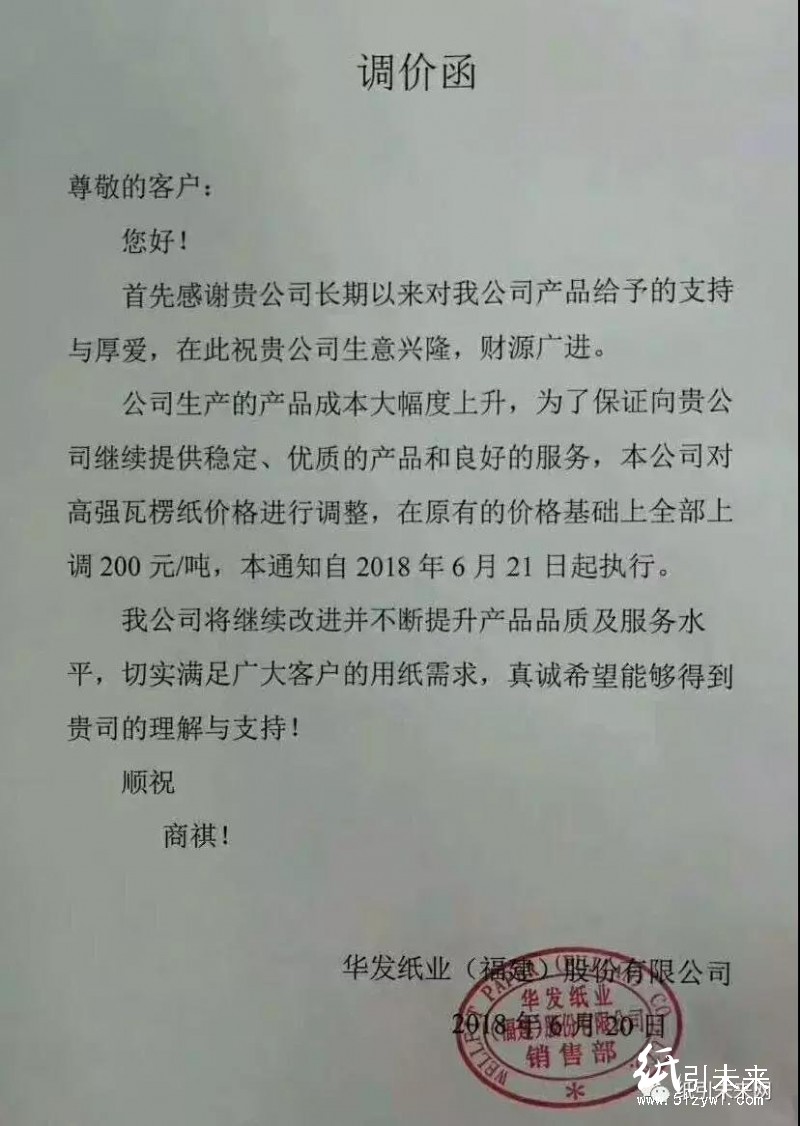 華發紙業(福建)股份有限公司:本公司對高強瓦楞紙價格進行調整,在原有的價格基礎上全部上調200元/噸。