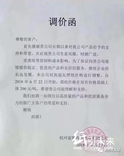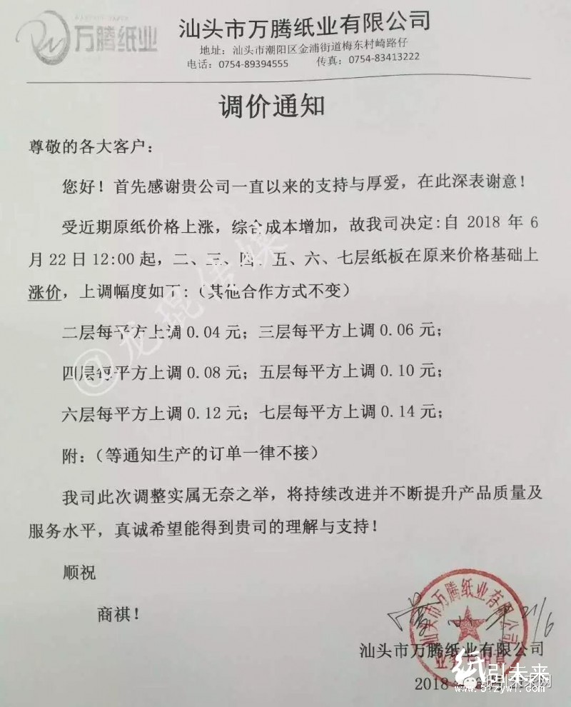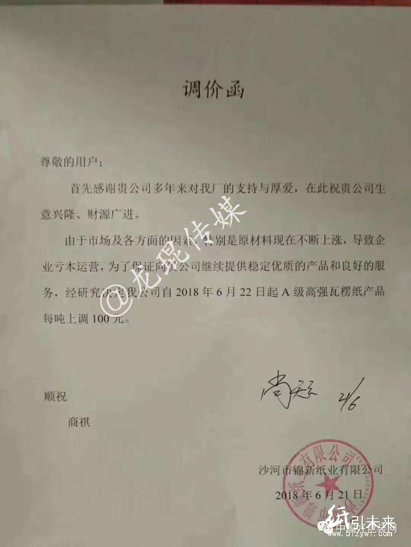 沙河市錦新紙業有限公司:自2018年6月22日起,A級高強瓦楞紙產品每噸上調100元。