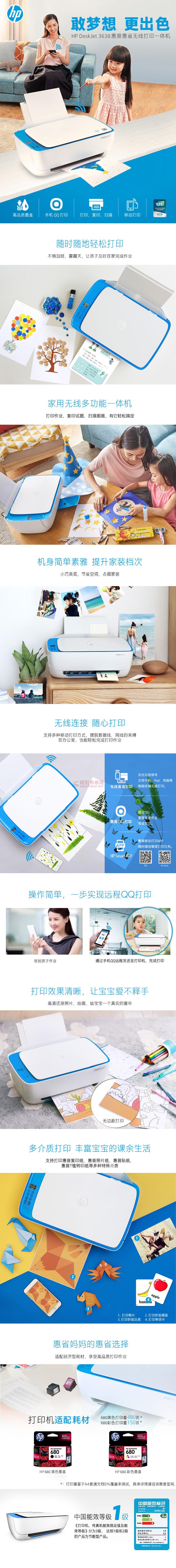 惠普(HP)DJ3638 A4幅面噴墨多功能一體機 打印/復印/掃描 支持無線打印 不支持自動雙面打印 適用耗材:680系列 一年保修