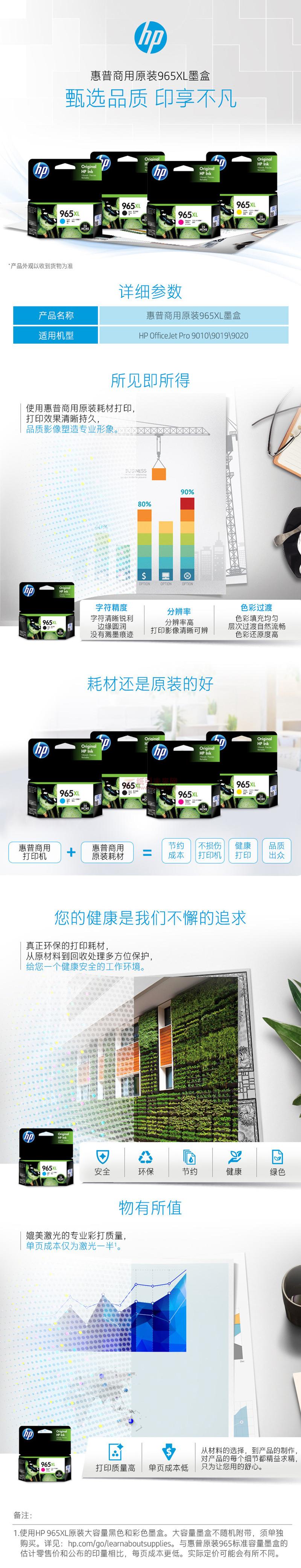 惠普(HP) 3JA81AA 青色大容量墨盒 965XL系列 1600頁打印量 適用機型:OfficeJet Pro 9010/9019/9020 單支裝