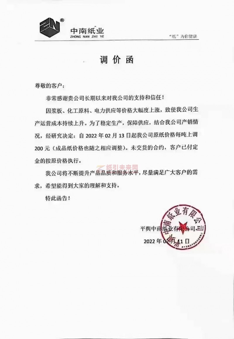 中南紙業:因漿板、化工原料、電力供應等價格大幅度上漲,致使我公司生產運營成本持續上升。為了穩定生產,保障供應,結合我公司產銷情況,經研究決定:自2022年02月13日起我公司原紙價格每噸上調200元(成品紙價格也隨之相應調整)。未交貨的合約,客戶已付定金的按原價格執行。