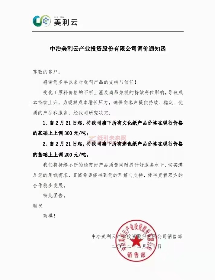 中治美利云投資股份限公司:受化工原料價格的不斷上漲及商品漿板的持續(xù)高位影響,導(dǎo)致成本持續(xù)上升,為緩解成本增長壓力,確保向客戶提供持續(xù)、穩(wěn)定、優(yōu)質(zhì)的產(chǎn)品和服務(wù),經(jīng)我司研究決定:
