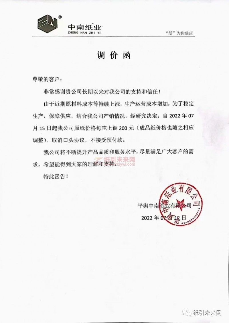 平輿中南紙業:由于近期原材料成本等持續上漲,生產運營成本增加,為了穩定生產,保障供應,結合我公司產銷情況,經研究決定:自2022年07月15日起我公司原紙價格每噸上調200元(成品紙價格也隨之相應調       整)。取消口頭協議,不接受預付款。