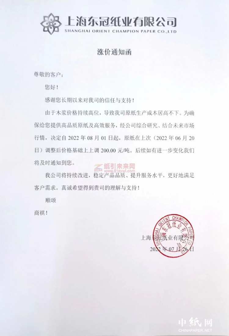 決定自2022年08月01日起,原紙在上次(2022年06月20日)調整后價格基礎上上調200.00元/噸。
